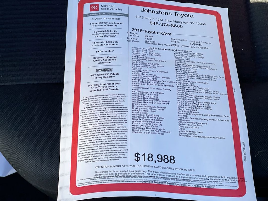 This 2016 Toyota RAV4 LE is a certified pre-owned SUV with low mileage of 69,997 miles. It is equipped with an all wheel drive system and a 2.5 liter 4 cylinder engine that is fuel efficient and powerful. The Barcelona Red Metallic exterior gives it a sleek look while the black 20 interior provides comfort and style. The RAV4 LE also comes with a 5 out of 5 star crash test rating, hill start assist, and on demand four wheel drive for added safety and performance. This car is sure to turn heads wherever it goes! Johnstons Toyota is located in New Hampton, NY and proudly serves Warwick, Middletown, and Newburgh, New York. We are a premier Toyota Dealer in New York providing a full line of new and used cars , trucks, vans, and SUVs.