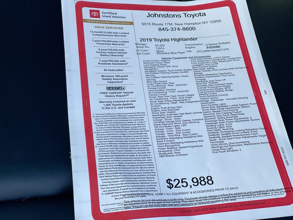 This 2019 Toyota Highlander XLE is a certified pre-owned SUV with an all wheel drive system and a 3.5 liter 6 cylinder engine. It has a 8v5 exterior in shoreline blue pearl and a black 20 interior. It has a 5 out of 5 star crash test rating and features such as blind spot sensor, hill start assist, on demand four wheel drive, navigation system with voice recognition, leather third row seats, and more. With 84,292 miles already driven, this car is sure to provide many years of reliable service. Johnstons Toyota is located in New Hampton, NY and proudly serves Warwick, Middletown, and Newburgh, New York. We are a premier Toyota Dealer in New York providing a full line of new and used cars , trucks, vans, and SUVs.