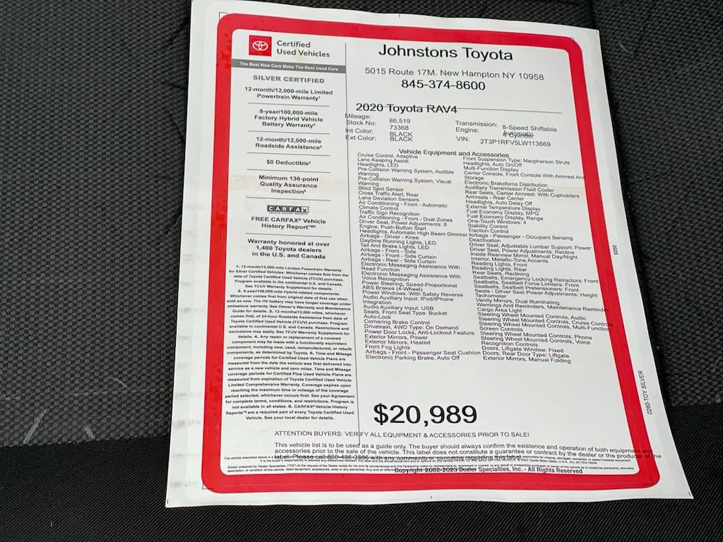 This 2020 Toyota RAV4 SUV all wheel drive is a certified pre-owned vehicle with 87,547 miles. It has a black exterior and a black interior, and is powered by a 2.5 liter 4 cylinder engine with fuel injection. The vehicle has been given a crash test rating of 5 out of 5 stars, and features such as blind spot sensor, hill start assist, and on demand four wheel drive. This car is sure to turn heads wherever it goes! Johnstons Toyota is located in New Hampton, NY and proudly serves Warwick, Middletown, and Newburgh, New York. We are a premier Toyota Dealer in New York providing a full line of new and used cars , trucks, vans, and SUVs.