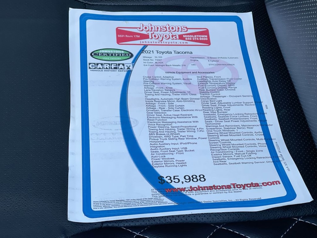 This 2021 Toyota Tacoma SR5 V6 Double Cab 4x4 is a reliable and powerful vehicle. With a low mileage of 34,163 miles, this car has been well taken care of and is ready to be driven. It features a 3.5 liter 6 cylinder engine with fuel injection and a midnight black metallic exterior. Inside, the car has a black interior and hill start assist for added safety. With a crash test rating of 4 out of 5 stars, this car is sure to provide you with peace of mind while on the road. Whether you're looking for a reliable car or just something stylish to cruise around in, this car has it all! Johnstons Toyota is located in New Hampton, NY and proudly serves Warwick, Middletown, and Newburgh, New York. We are a premier Toyota Dealer in New York providing a full line of new and used cars , trucks, vans, and SUVs.