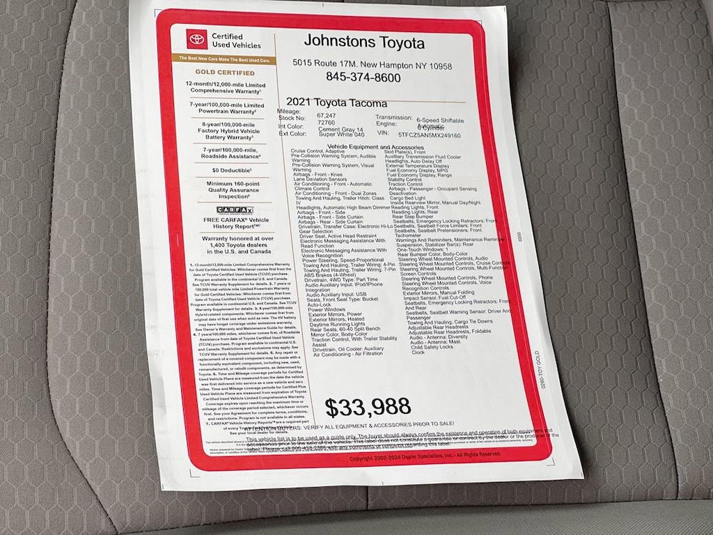 This 2021 Toyota Tacoma SR V6 Double Cab 4x4 is a certified pre-owned vehicle that has driven 67,247 miles. It is powered by a 3.5 liter 6 cylinder engine with fuel injection and has a super white 040 exterior. Inside, it has a cement gray 14 interior and boasts a 4 out of 5 star crash test rating. Hill start assist and part time four wheel drive are just a few of the features that make this car stand out from the rest. With its combination of power, safety, and style, this car is sure to turn heads wherever it goes. Johnstons Toyota is located in New Hampton, NY and proudly serves Warwick, Middletown, and Newburgh, New York. We are a premier Toyota Dealer in New York providing a full line of new and used cars , trucks, vans, and SUVs.