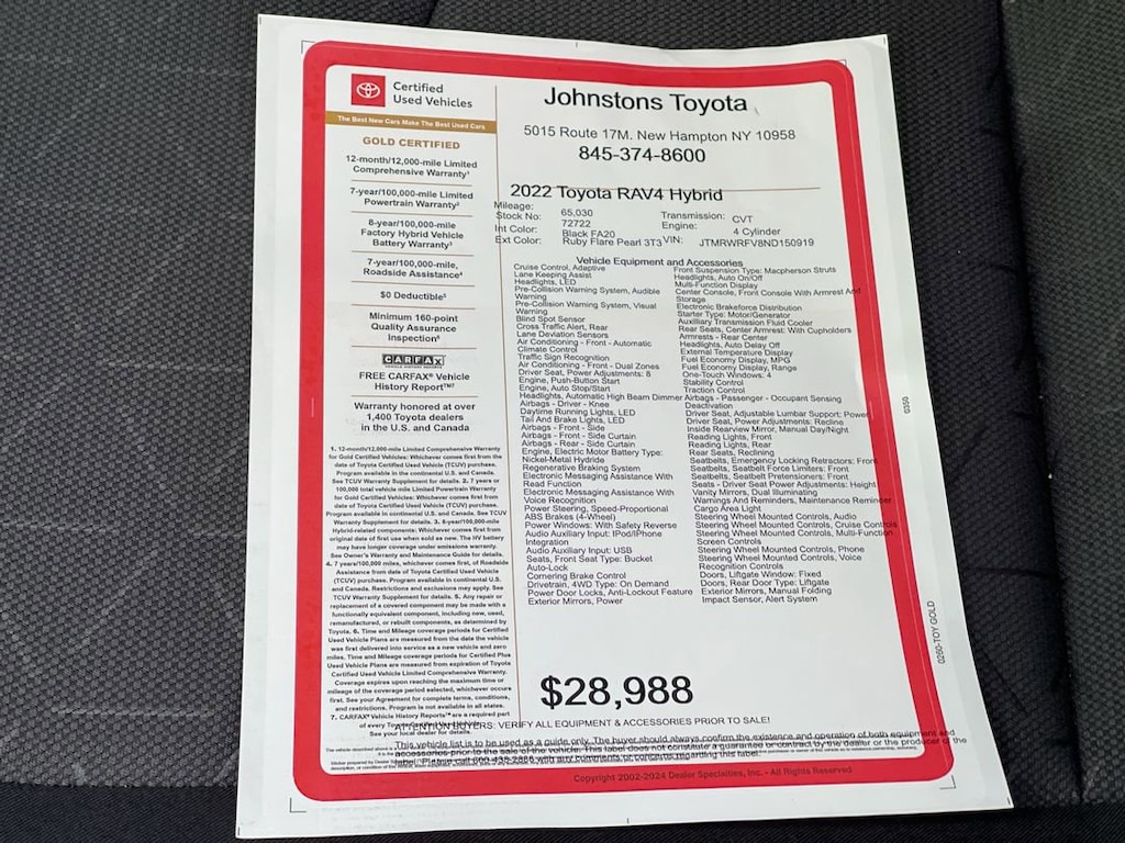 This vehicle is a 2022 Toyota RAV4 Hybrid XLE, certified pre-owned and with 65,030 miles. It has an all wheel drive system and a 2.5 liter 4 cylinder engine, making it an efficient and powerful motorcar. The exterior of the car is a ruby flare pearl 3t3 color, while the interior is finished in black. It has a crash test rating of 5 out of 5 stars, making it one of the safest cars on the market today. Additionally, this Vehicle features blind spot sensor, hill start assist, and on demand four wheel drive for added safety and convenience. With its impressive features and safety ratings, this Vehicle is sure to be a reliable choice for anyone looking for an all wheel drive car in 2022. Johnstons Toyota is located in New Hampton, NY and proudly serves Warwick, Middletown, and Newburgh, New York. We are a premier Toyota Dealer in New York providing a full line of new and used cars , trucks, vans, and SUVs.