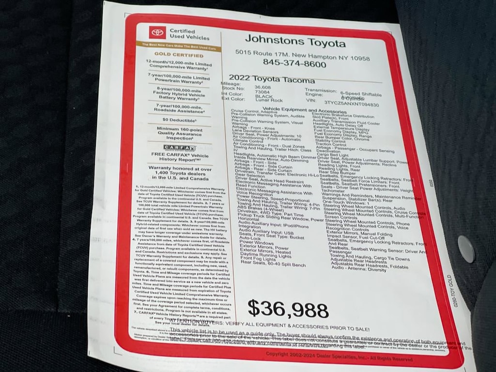 This vehicle is a 2022 Toyota Tacoma SR5 V6 Double Cab 4x4, certified pre-owned and with 36,608 miles. It has a lunar rock 6x3 exterior and a black interior, and is powered by a 3.5 liter 6 cylinder engine with fuel injection. It has a crash test rating of 4 out of 5 stars, hill start assist, and part time four wheel drive for added control and stability. This car is sure to turn heads wherever it goes! Johnstons Toyota is located in New Hampton, NY and proudly serves Warwick, Middletown, and Newburgh, New York. We are a premier Toyota Dealer in New York providing a full line of new and used cars , trucks, vans, and SUVs.