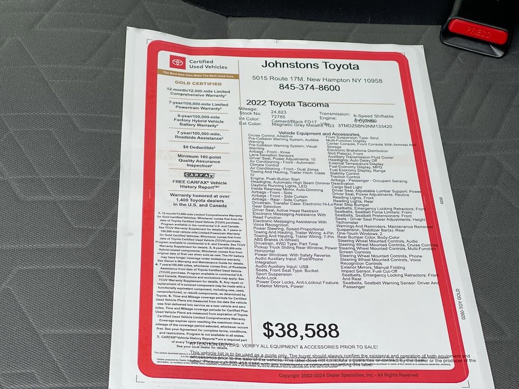 This vehicle is a 2022 Toyota Tacoma TRD Sport Double Cab 4x4, certified pre-owned with 24,823 miles. It has a low mileage and an impressive 4 out of 5 stars on its crash test rating. The 3.5 liter 6 cylinder engine is fuel injected and has a magnetic gray metallic exterior. The interior is finished in cement/black and features Hill Start Assist and Part Time Four Wheel Drive for added convenience. This car is sure to turn heads on the road! Johnstons Toyota is located in New Hampton, NY and proudly serves Warwick, Middletown, and Newburgh, New York. We are a premier Toyota Dealer in New York providing a full line of new and used cars , trucks, vans, and SUVs.