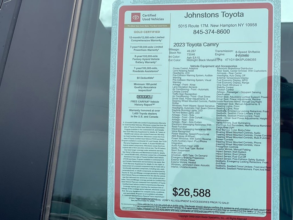 This vehicle is a 2023 Toyota Camry SE, a certified pre-owned sedan with all wheel drive and a 2.5 liter 4 cylinder engine that has been driven 49,287 miles. It has an ash ea10 interior and an ash ea10 exterior, making it stand out from the crowd. It has been awarded a 5 out of 5 star crash test rating, and comes with features such as hill start assist and on demand four wheel drive. This car is sure to turn heads wherever it goes! Johnstons Toyota is located in New Hampton, NY and proudly serves Warwick, Middletown, and Newburgh, New York. We are a premier Toyota Dealer in New York providing a full line of new and used cars , trucks, vans, and SUVs.