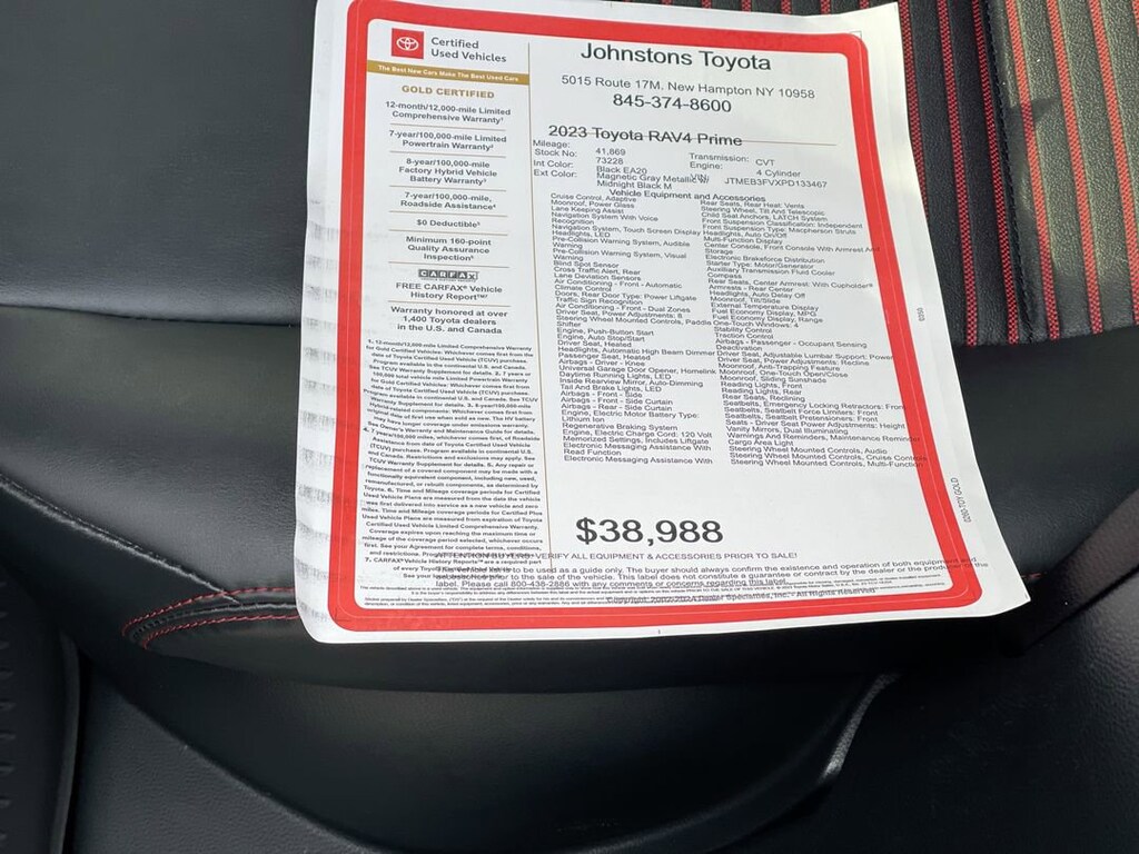 The 2023 Toyota RAV4 Prime XSE is a certified pre-owned SUV all wheel drive that has driven 41,869 miles. It is powered by a 2.5 liter 4 cylinder engine that has been paired with an all magnetic gray metallic w/midnight black m exterior and a black ea20 interior. This vehicle has received a 5 out of 5 star crash test rating and features such as blind spot sensor, hill start assist, on demand four wheel drive, navigation system with voice recognition, and navigation with touch screen display. With its impressive combination of power, safety, and luxury features, this car is sure to turn heads wherever it goes. Johnstons Toyota is located in New Hampton, NY and proudly serves Warwick, Middletown, and Newburgh, New York. We are a premier Toyota Dealer in New York providing a full line of new and used cars , trucks, vans, and SUVs.
