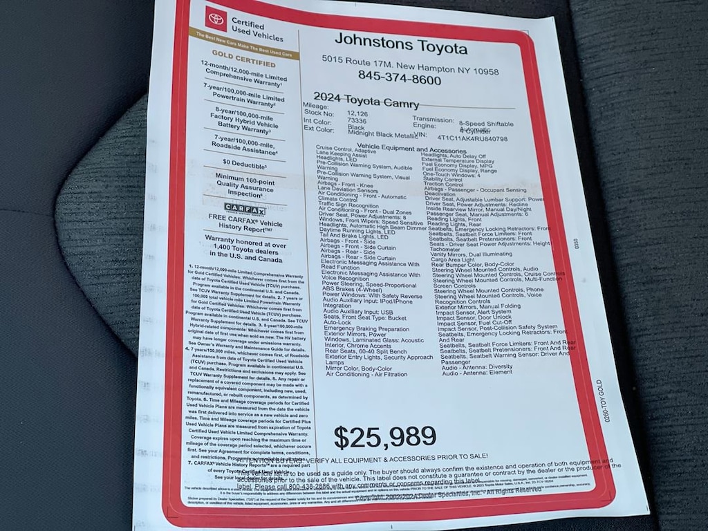 This 2024 Toyota Camry Sedan is a certified pre-owned vehicle with low mileage of 12,126. It has a 2.5 liter 4 cylinder engine with fuel injection and a midnight black metallic exterior. It has a black interior and a crash test rating of 5 out of 5 stars. This car has many features including hill start assist, making it an excellent choice for any driver. With its low price and high safety rating, this car is sure to be a great investment for anyone looking for a reliable ride. Johnstons Toyota is located in New Hampton, NY and proudly serves Warwick, Middletown, and Newburgh, New York. We are a premier Toyota Dealer in New York providing a full line of new and used cars , trucks, vans, and SUVs.