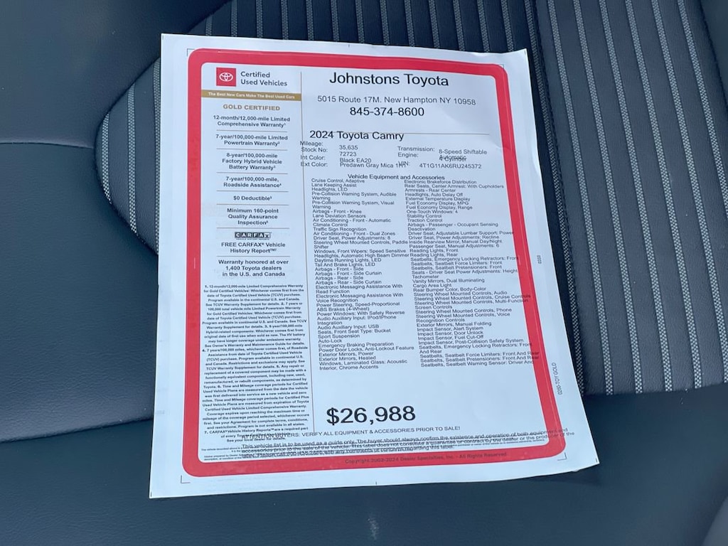 This vehicle is a 2024 Toyota Camry SE, certified pre-owned and with 35,635 miles. It has a FWD 2.5 liter 4 cylinder engine with fuel injection and a predawn gray mica 1h1 exterior. It has a black ea20 interior and a crash test rating of 5 out of 5 stars. Hill start assist is also included for added safety and convenience. This car is sure to turn heads with its sleek design and powerful performance. Johnstons Toyota is located in New Hampton, NY and proudly serves Warwick, Middletown, and Newburgh, New York. We are a premier Toyota Dealer in New York providing a full line of new and used cars , trucks, vans, and SUVs.