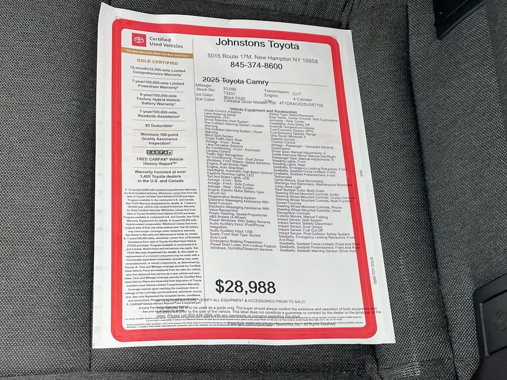This vehicle is a 2025 Toyota Camry LE, a certified pre-owned sedan with a 2.5 liter 4 cylinder engine and FWD. It has a celestial silver metallic exterior and a black fa20 interior, giving it a sleek and modern look. It has 23,690 miles on it and a crash test rating of 5 out of 5 stars, making it one of the safest cars on the road today. It also comes with blind spot sensor and hill start assist features, making it even more reliable and safe to drive. With its impressive features and impressive performance, this car is sure to turn heads on the road. Johnstons Toyota is located in New Hampton, NY and proudly serves Warwick, Middletown, and Newburgh, New York. We are a premier Toyota Dealer in New York providing a full line of new and used cars , trucks, vans, and SUVs.