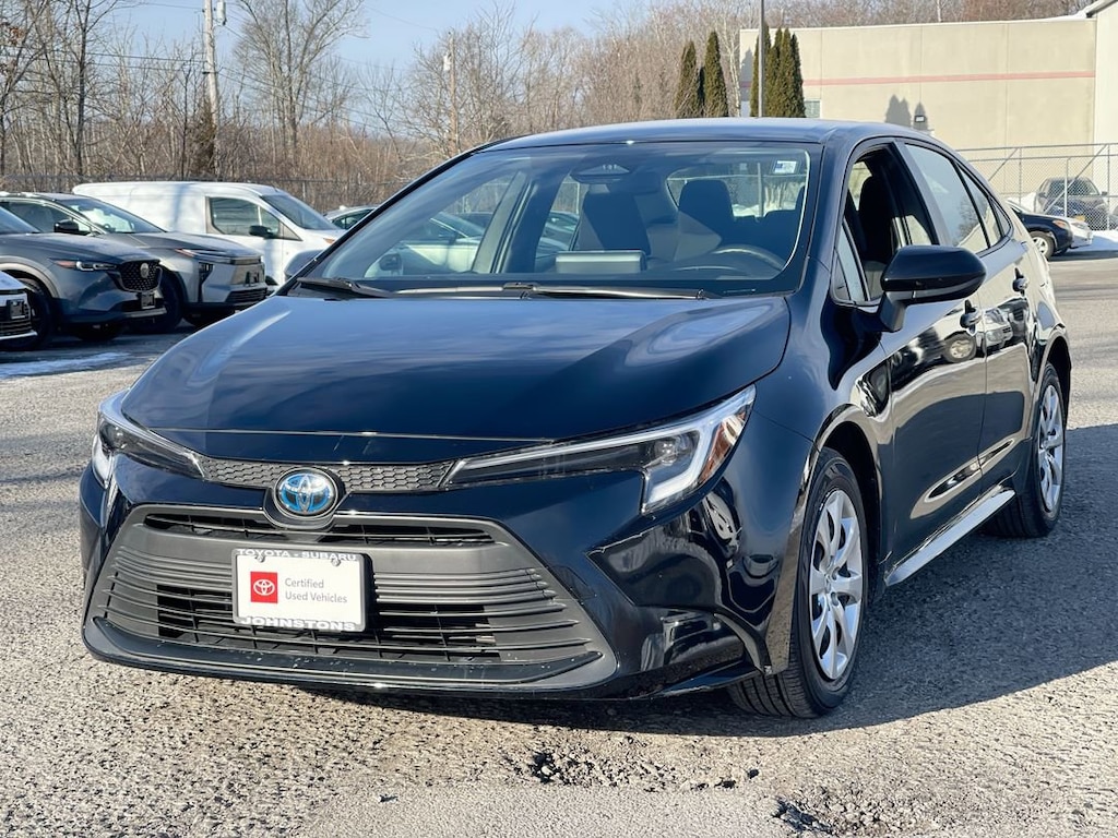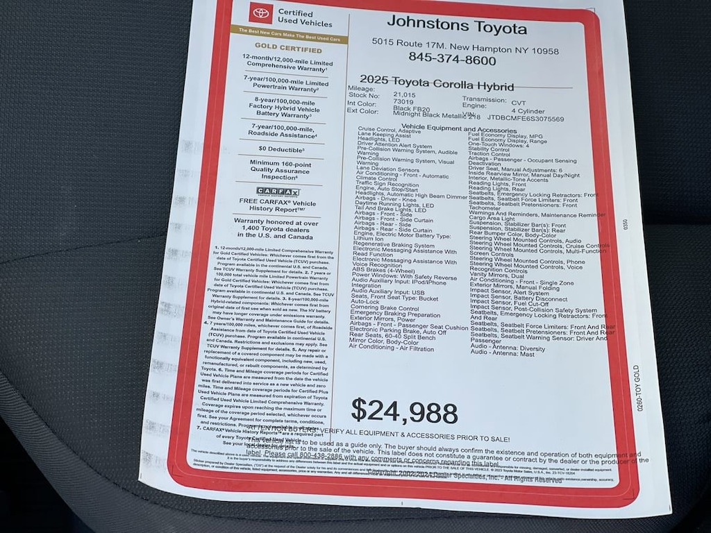 This vehicle is a 2025 Toyota Corolla Hybrid LE, certified pre-owned and with 21,015 miles. It has a FWD 1.8 liter 4 cylinder engine with sequential port fuel injection and a midnight black metallic exterior. It has a black fb20 interior and a crash test rating of 5 out of 5 stars. This car has many great features such as hill start assist, making it an excellent choice for any driver. With its sleek design and reliable performance, this car is sure to turn heads wherever it goes. Johnstons Toyota is located in New Hampton, NY and proudly serves Warwick, Middletown, and Newburgh, New York. We are a premier Toyota Dealer in New York providing a full line of new and used cars , trucks, vans, and SUVs.