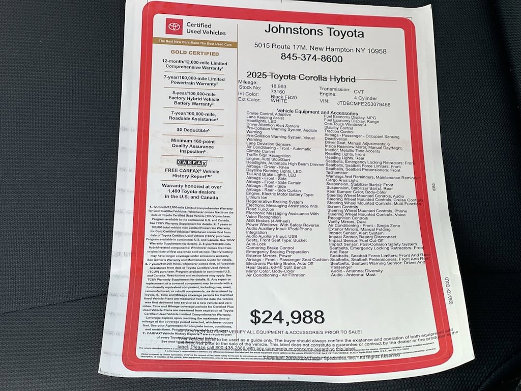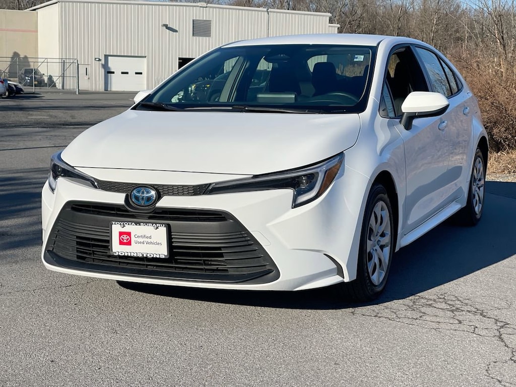 This vehicle is a 2025 Toyota Corolla Hybrid LE, certified pre-owned and with 18,993 miles. It has a white exterior and a black fb20 interior, and is powered by a 1.8 liter 4 cylinder engine with sequential port fuel injection. It has received a crash test rating of 5 out of 5 stars, making it one of the safest cars on the road today. Additionally, this car comes equipped with Hill Start Assist, making it easy to drive up and down hills without the need for any additional assistance. This car truly offers the best of both worlds - the convenience of a modern car with the reliability of a classic one. Johnstons Toyota is located in New Hampton, NY and proudly serves Warwick, Middletown, and Newburgh, New York. We are a premier Toyota Dealer in New York providing a full line of new and used cars , trucks, vans, and SUVs.