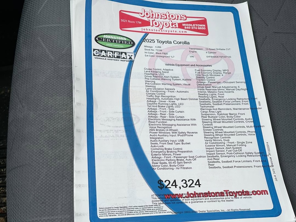 This vehicle is a 2025 Toyota Corolla LE Sedan, certified pre-owned and with 4,281 miles. It has a low mileage of 4,281 miles and is equipped with a 2.0 liter 4 cylinder engine with fuel injection and FWD. It has an underground 1l7 exterior and a black fb20 interior. It has a crash test rating of 5 out of 5 stars and features such as hill start assist. This car is sure to turn heads with its sleek design and modern features. Johnstons Toyota is located in New Hampton, NY and proudly serves Warwick, Middletown, and Newburgh, New York. We are a premier Toyota Dealer in New York providing a full line of new and used cars , trucks, vans, and SUVs.