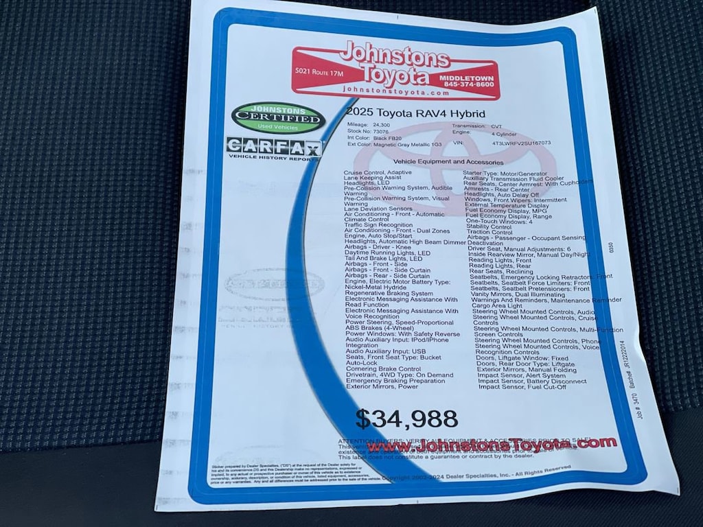 This vehicle is a 2025 Toyota RAV4 Hybrid LE, with an all wheel drive and a 2.5 liter 4 cylinder engine. It has been driven 24,300 miles and is certified pre-owned. The exterior of the car is magnetic gray metallic 1g3, while the interior is black fb20. This vehicle also comes with hill start assist and on demand four wheel drive, making it an ideal choice for those looking for a reliable and safe car. With its low mileage and advanced features, this car is sure to provide years of dependable service. Johnstons Toyota is located in New Hampton, NY and proudly serves Warwick, Middletown, and Newburgh, New York. We are a premier Toyota Dealer in New York providing a full line of new and used cars , trucks, vans, and SUVs.