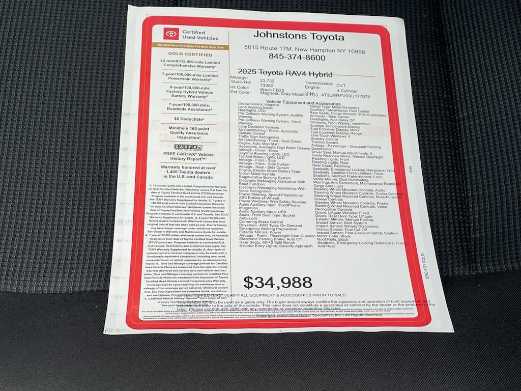 This vehicle is a 2025 Toyota RAV4 Hybrid LE, certified pre-owned and with 23,732 miles. It is an all wheel drive vehicle with a 2.5 liter 4 cylinder engine and a magnetic gray metallic exterior. It has a black fb20 interior and hill start assist, on demand four wheel drive, making it an ideal choice for any driver. With its impressive features and performance, this car is sure to turn heads on the road. Johnstons Toyota is located in New Hampton, NY and proudly serves Warwick, Middletown, and Newburgh, New York. We are a premier Toyota Dealer in New York providing a full line of new and used cars , trucks, vans, and SUVs.