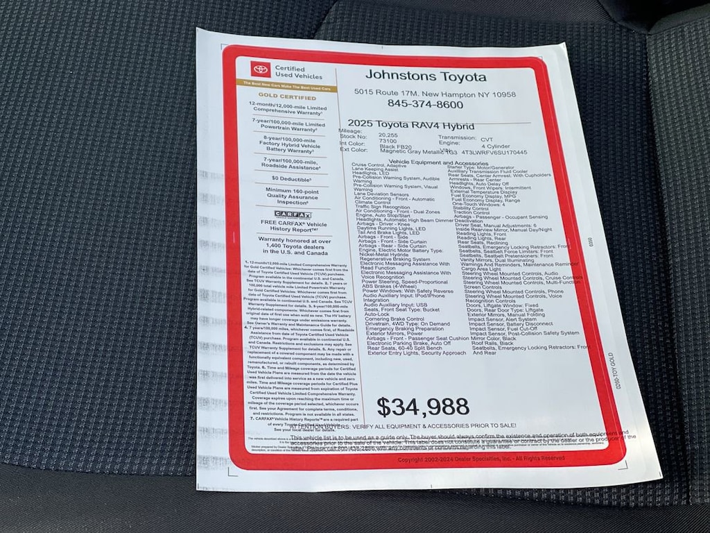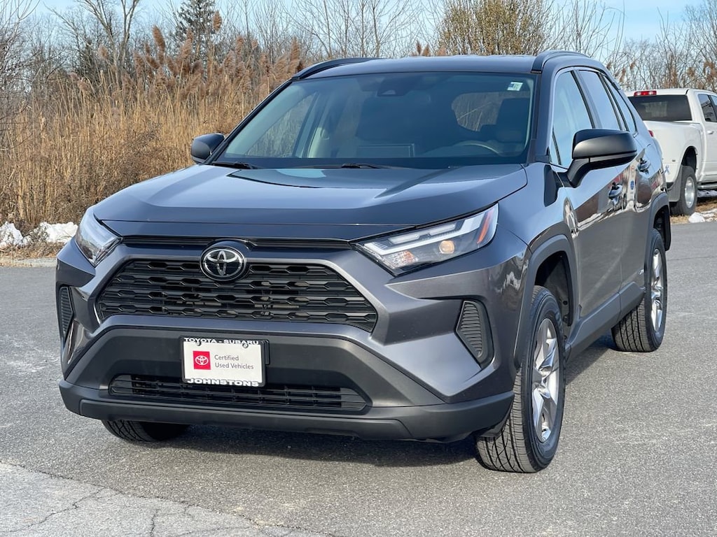 This vehicle is a 2025 Toyota RAV4 Hybrid LE, a certified pre-owned car with 20,255 miles. It is equipped with an all wheel drive system and a 2.5 liter 4 cylinder engine that produces 180 horsepower. The magnetic gray metallic exterior and black interior give this car a sleek and modern look, while the hill start assist and on demand four wheel drive add to its practicality. This car is sure to turn heads on the road! Johnstons Toyota is located in New Hampton, NY and proudly serves Warwick, Middletown, and Newburgh, New York. We are a premier Toyota Dealer in New York providing a full line of new and used cars , trucks, vans, and SUVs.
