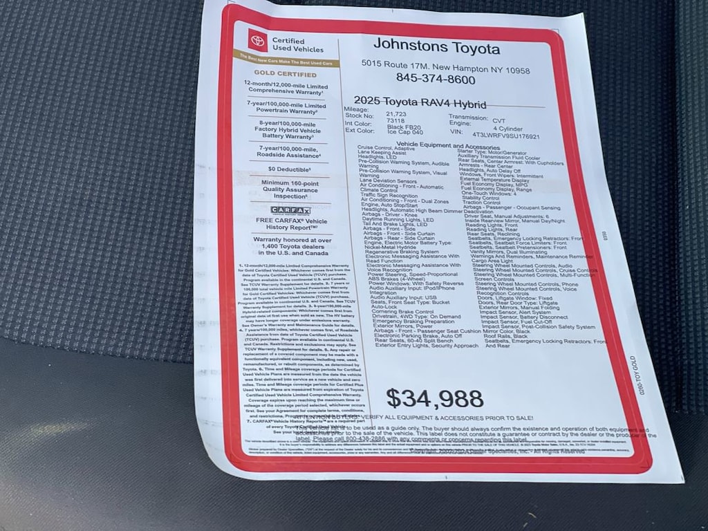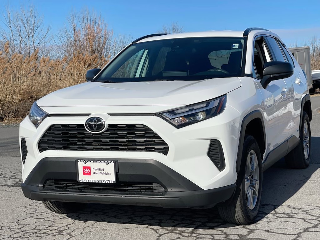 This vehicle is a 2025 Toyota RAV4 Hybrid LE, a certified pre-owned car with 21,723 miles. It is powered by an all wheel drive 2.5 liter 4 cylinder engine and features Hill Start Assist and On Demand Four Wheel Drive for added safety and control. The exterior of this car is ice cap 040 and the interior is black in color. This car is sure to turn heads with its sleek design and powerful performance. Johnstons Toyota is located in New Hampton, NY and proudly serves Warwick, Middletown, and Newburgh, New York. We are a premier Toyota Dealer in New York providing a full line of new and used cars , trucks, vans, and SUVs.