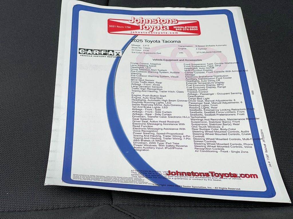 This vehicle is a 2025 Toyota Tacoma Double Cab 4x4, with low mileage of 2413 miles. It is a powerful and efficient motorcar, with a 2.4 liter 4 cylinder engine and turbocharged power. It has a supersonic red exterior and a black interior, giving it a sleek and modern look. It has a crash test rating of 4 out of 5 stars, making it a safe and reliable option for anyone looking for a reliable car. It also comes with a number of features such as blind spot sensor, hill start assist, and part time four wheel drive, making it an all-around great motorcar for any driver. Johnstons Toyota is located in New Hampton, NY and proudly serves Warwick, Middletown, and Newburgh, New York. We are a premier Toyota Dealer in New York providing a full line of new and used cars , trucks, vans, and SUVs.