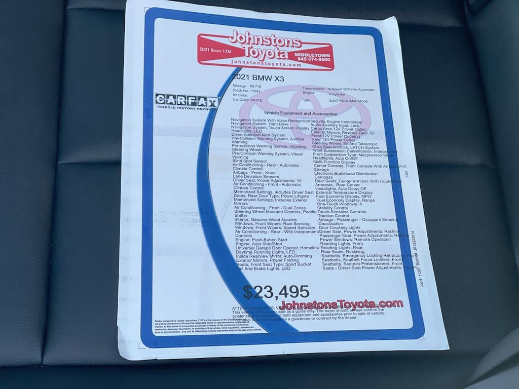 This 2021 BMW X3 xDrive30i is a Sports Activity Vehicle with all wheel drive, and it has been driven 59,718 miles. It features a 2.0 liter 4 cylinder engine with turbocharged power, and a white exterior that gives it a sleek and modern look. This vehicle has been rated 5 out of 5 stars for crash test safety, and comes with a variety of features such as blind spot sensor, hill start assist, full time four wheel drive, navigation system with voice recognition, and a touch screen display. With its combination of style, performance, and safety, this car is sure to make an excellent choice for any driver. Johnstons Toyota is located in New Hampton, NY and proudly serves Warwick, Middletown, and Newburgh, New York. We are a premier Toyota Dealer in New York providing a full line of new and used cars , trucks, vans, and SUVs.