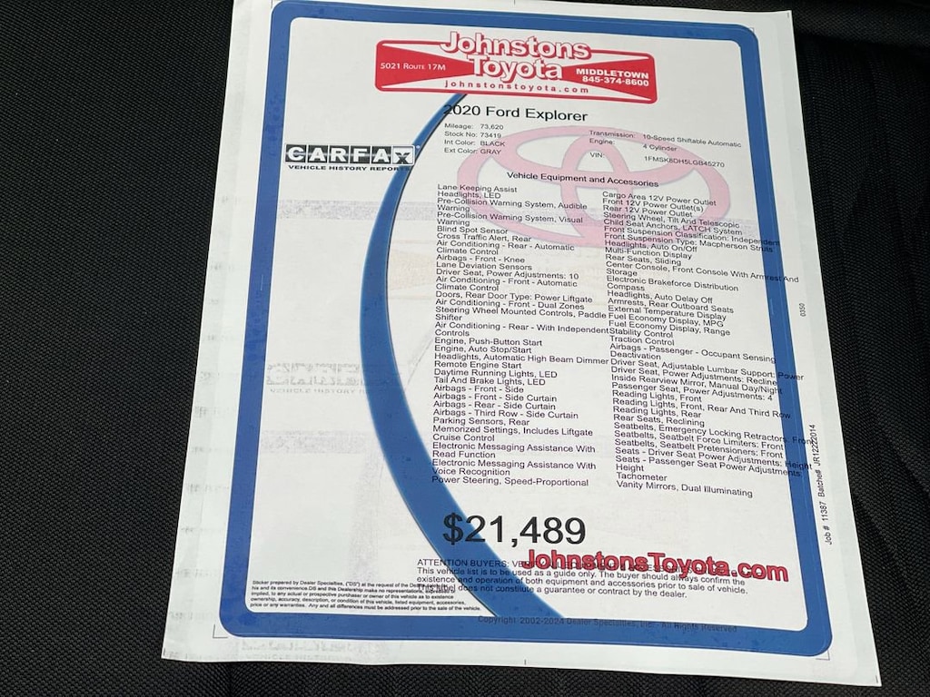 This 2020 Ford Explorer XLT is a reliable and safe vehicle that has been driven 73,620 miles. It features an all wheel drive system with a 2.3 liter 4 cylinder turbocharged engine, and has a gray exterior with a black interior. The car has been given a crash test rating of 5 out of 5 stars, making it one of the safest cars on the market. Additionally, this car comes with many features such as blind spot sensor, hill start assist, and on demand four wheel drive to ensure that you have the best driving experience possible. Johnstons Toyota is located in New Hampton, NY and proudly serves Warwick, Middletown, and Newburgh, New York. We are a premier Toyota Dealer in New York providing a full line of new and used cars , trucks, vans, and SUVs.