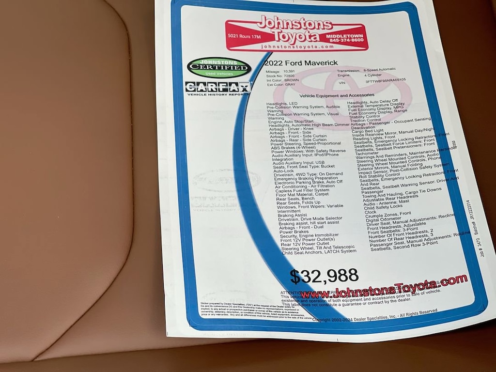 This 2022 Ford Maverick is a low mileage all wheel drive vehicle with a 2.0 liter 4 cylinder engine and turbocharged power. It has an exterior of gray and an interior of brown, making it a stylish and comfortable ride. It has 10,879 miles on it and features Hill Start Assist and On Demand Four Wheel Drive for added safety and control. This car is sure to turn heads on the road and make any journey more enjoyable. Johnstons Toyota is located in New Hampton, NY and proudly serves Warwick, Middletown, and Newburgh, New York. We are a premier Toyota Dealer in New York providing a full line of new and used cars , trucks, vans, and SUVs.