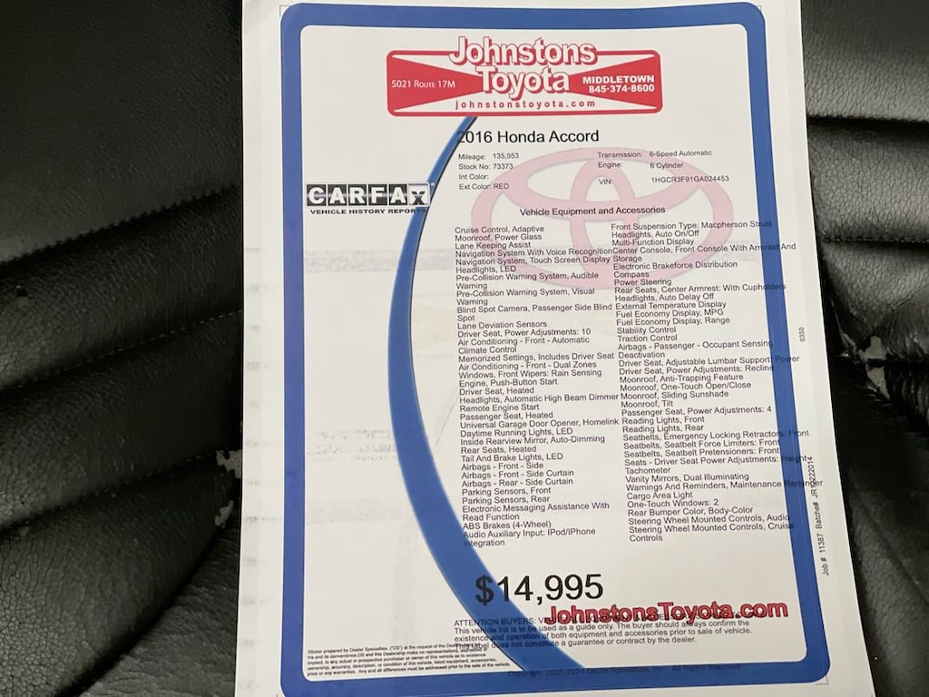 This vehicle is a 2016 Honda Accord Sedan, with a 3.5 liter 6 cylinder engine and sequential port fuel injection. It has a red exterior and has been driven 135,953 miles. The car also comes with a number of features, such as hill start assist, navigation system with voice recognition, and navigation with touch screen display. This car is sure to provide you with a reliable and comfortable ride, making it an excellent choice for anyone looking for an automobile that can meet their needs. Johnstons Toyota is located in New Hampton, NY and proudly serves Warwick, Middletown, and Newburgh, New York. We are a premier Toyota Dealer in New York providing a full line of new and used cars , trucks, vans, and SUVs.