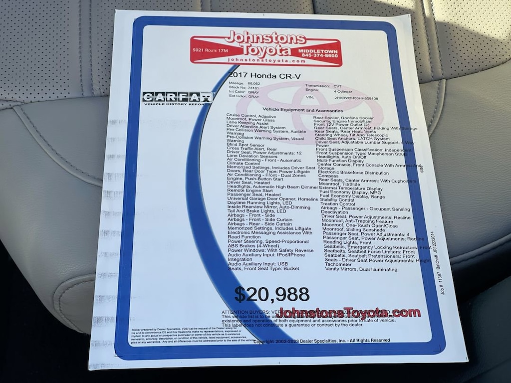This 2017 Honda CR-V SUV is a reliable and efficient vehicle with low mileage. It has an all wheel drive system and a 1.5 liter 4 cylinder engine with turbocharging, making it an efficient and powerful motorcar. The exterior of the car is gray while the interior is a light gray color. This vehicle also features blind spot sensor and hill start assist technology, as well as on demand four wheel drive capabilities. With its low mileage and reliable performance, this car is sure to be a great choice for anyone looking for a reliable car. Johnstons Toyota is located in New Hampton, NY and proudly serves Warwick, Middletown, and Newburgh, New York. We are a premier Toyota Dealer in New York providing a full line of new and used cars , trucks, vans, and SUVs.