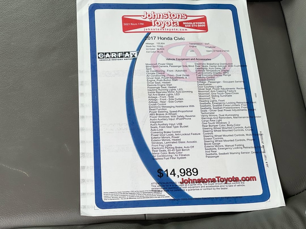 This 2017 Honda Civic Sedan is a reliable and efficient vehicle. It has a 1.5 liter 4 cylinder engine with turbocharged power, and Front Wheel Drive for added stability. The exterior is a sleek blue color, while the interior is black for a classic look. With 122,824 miles already driven, this car still has plenty of life left in it. It also comes with hill start assist as an added feature to make driving even easier. Whether you're looking for a daily driver or something to take on long trips, this car is sure to meet your needs. Johnstons Toyota is located in New Hampton, NY and proudly serves Warwick, Middletown, and Newburgh, New York. We are a premier Toyota Dealer in New York providing a full line of new and used cars , trucks, vans, and SUVs.