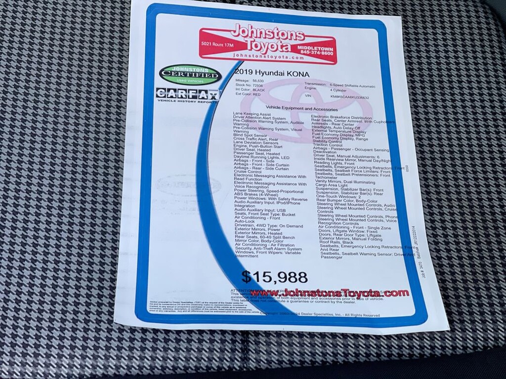 This 2019 Hyundai Crossover all wheel drive KONA is a reliable and efficient motorcar that offers a 2.0 liter 4 cylinder engine with sequential port fuel injection and low mileage of 56,530 miles. It has a red exterior and black interior, and its 5 out of 5 stars crash test rating makes it an excellent choice for those looking for safety. It also comes with features such as blind spot sensor, hill start assist, and on demand four wheel drive for added convenience. This automobile is sure to make any driver feel safe and secure on the roads. Johnstons Toyota is located in New Hampton, NY and proudly serves Warwick, Middletown, and Newburgh, New York. We are a premier Toyota Dealer in New York providing a full line of new and used cars , trucks, vans, and SUVs.
