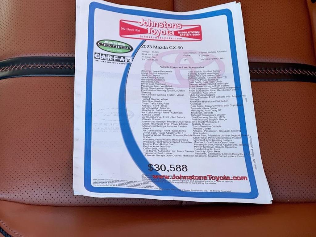 This 2023 Mazda SUV CX-50 2.5 Turbo Premium is a state-of-the-art motorcar that has been meticulously maintained. With 33,425 miles on the odometer, this all wheel drive vehicle has been driven by only one owner and features a blue exterior and tan interior. It has a 2.5 liter 4 cylinder engine with turbocharging and a 5 out of 5 star crash test rating, making it one of the safest cars on the road today. Additionally, it offers blind spot sensor, hill start assist, and on demand four wheel drive for added convenience. This car truly offers the best of both worlds - style and performance! Johnstons Toyota is located in New Hampton, NY and proudly serves Warwick, Middletown, and Newburgh, New York. We are a premier Toyota Dealer in New York providing a full line of new and used cars , trucks, vans, and SUVs.