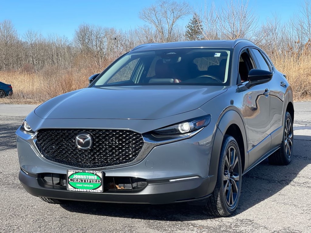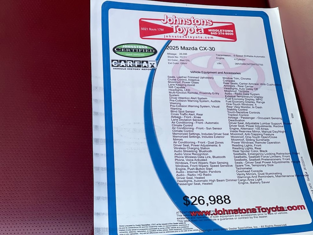 This 2025 Mazda SUV CX-30 2.5 S Carbon Edition is a state-of-the-art motorcar that has been meticulously crafted to provide superior performance and comfort. Boasting an all-wheel drive system, this vehicle has driven 26,096 miles and is powered by a 2.5 liter 4 cylinder engine with fuel injection. The exterior of the car is a striking gray color, while the interior is finished in a luxurious red leather-trimmed design. Safety features include a crash test rating of 5 out of 5 stars, as well as blind spot sensors, hill start assist, and on demand four wheel drive. Bluetooth audio connection, and Bluetooth phone connectivity are also included for added convenience. This car truly offers the best of both worlds - style and substance! Johnstons Toyota is located in New Hampton, NY and proudly serves Warwick, Middletown, and Newburgh, New York. We are a premier Toyota Dealer in New York providing a full line of new and used cars , trucks, vans, and SUVs.