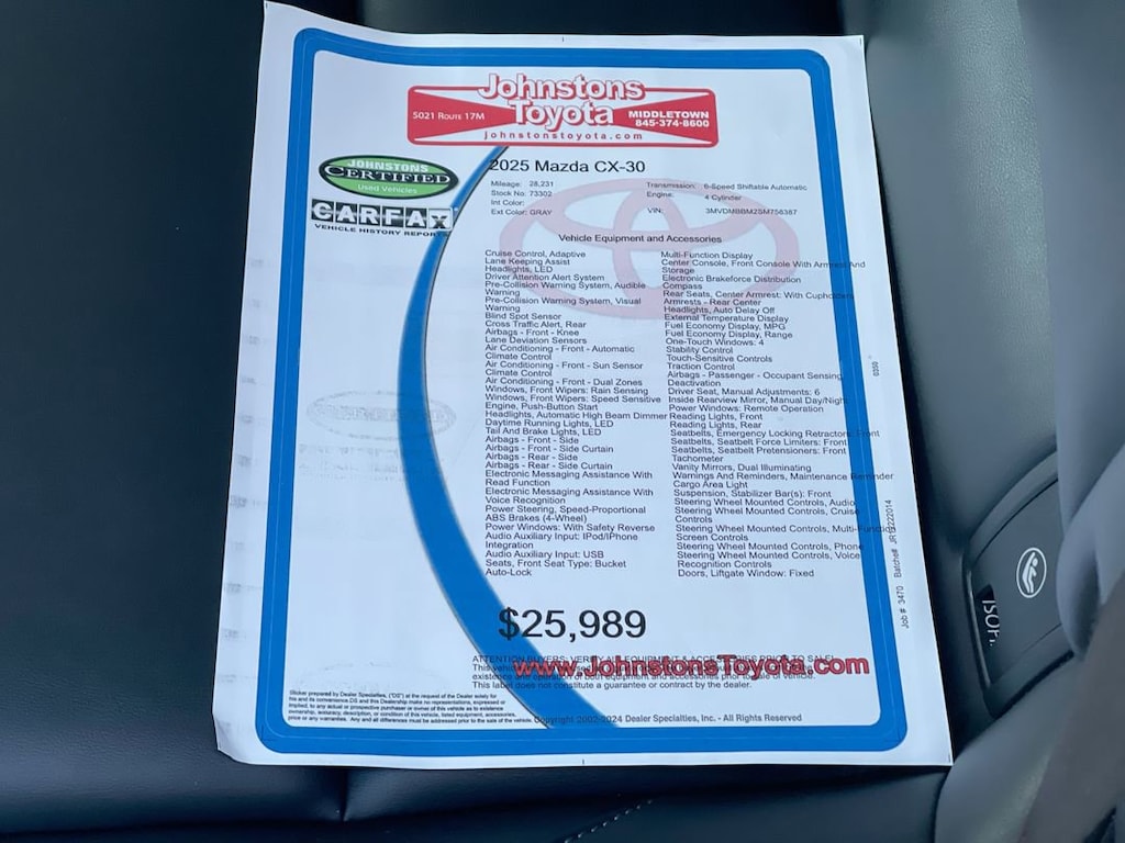 This 2025 Mazda SUV CX-30 is a state-of-the-art motorcar, with all-wheel drive and a 2.5 liter 4 cylinder engine that has been fuel injected. It has driven 28,231 miles and boasts a crash test rating of 5 out of 5 stars. The car's exterior is gray in color and it has been outfitted with a number of modern features, including blind spot sensor, hill start assist, and on demand four wheel drive. This vehicle is sure to provide drivers with a safe and comfortable ride for years to come. Johnstons Toyota is located in New Hampton, NY and proudly serves Warwick, Middletown, and Newburgh, New York. We are a premier Toyota Dealer in New York providing a full line of new and used cars , trucks, vans, and SUVs.