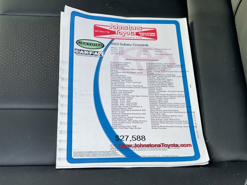 This vehicle is a 2023 Subaru Crosstrek Limited, an all-wheel drive with a 2.5 liter 4 cylinder engine and fuel injection. It has driven 20,350 miles and has a blue exterior with a black interior. It has a crash test rating of 5 out of 5 stars and features such as blind spot sensor, hill start assist, and full time four wheel drive. This car is sure to turn heads with its sleek design and modern features. Johnstons Toyota is located in New Hampton, NY and proudly serves Warwick, Middletown, and Newburgh, New York. We are a premier Toyota Dealer in New York providing a full line of new and used cars , trucks, vans, and SUVs.