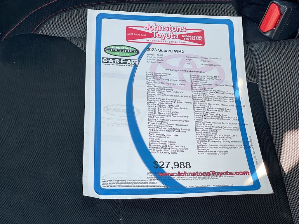 This vehicle is a 2023 Subaru Sedan WRX Base, with an all wheel drive system and a 2.4 liter 4 cylinder engine that has been turbocharged. It has driven 32,883 miles and has a gray exterior with a black interior. It has been awarded a 5 out of 5 star crash test rating, and features such as hill start assist and full time four wheel drive make it an ideal choice for any driver. With its combination of power, safety, and style, this car is sure to turn heads wherever it goes. Johnstons Toyota is located in New Hampton, NY and proudly serves Warwick, Middletown, and Newburgh, New York. We are a premier Toyota Dealer in New York providing a full line of new and used cars , trucks, vans, and SUVs.