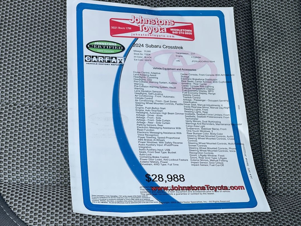 This vehicle is a 2024 Subaru Crosstrek Crossover all wheel drive, with a 2.0 liter 4 cylinder engine and fuel injection. It has driven 33,880 miles and has a white exterior with a black interior. It has a crash test rating of 5 out of 5 stars, and features such as hill start assist and full time four wheel drive. This car is sure to turn heads with its sleek design and modern technology. Johnstons Toyota is located in New Hampton, NY and proudly serves Warwick, Middletown, and Newburgh, New York. We are a premier Toyota Dealer in New York providing a full line of new and used cars , trucks, vans, and SUVs.