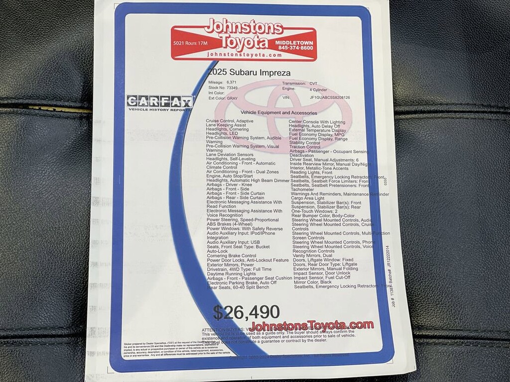 This vehicle is a 2025 Subaru Impreza Wagon all wheel drive, with a low mileage of 6,371 miles. It is equipped with a 2.0 liter 4 cylinder engine that is fuel injected and has a gray exterior. This vehicle has been given a crash test rating of 5 out of 5 stars, making it one of the safest vehicles on the road today. Hill start assist and full time four wheel drive are also included as standard features, making this car an excellent choice for anyone looking for a reliable and safe motorcar. Johnstons Toyota is located in New Hampton, NY and proudly serves Warwick, Middletown, and Newburgh, New York. We are a premier Toyota Dealer in New York providing a full line of new and used cars , trucks, vans, and SUVs.