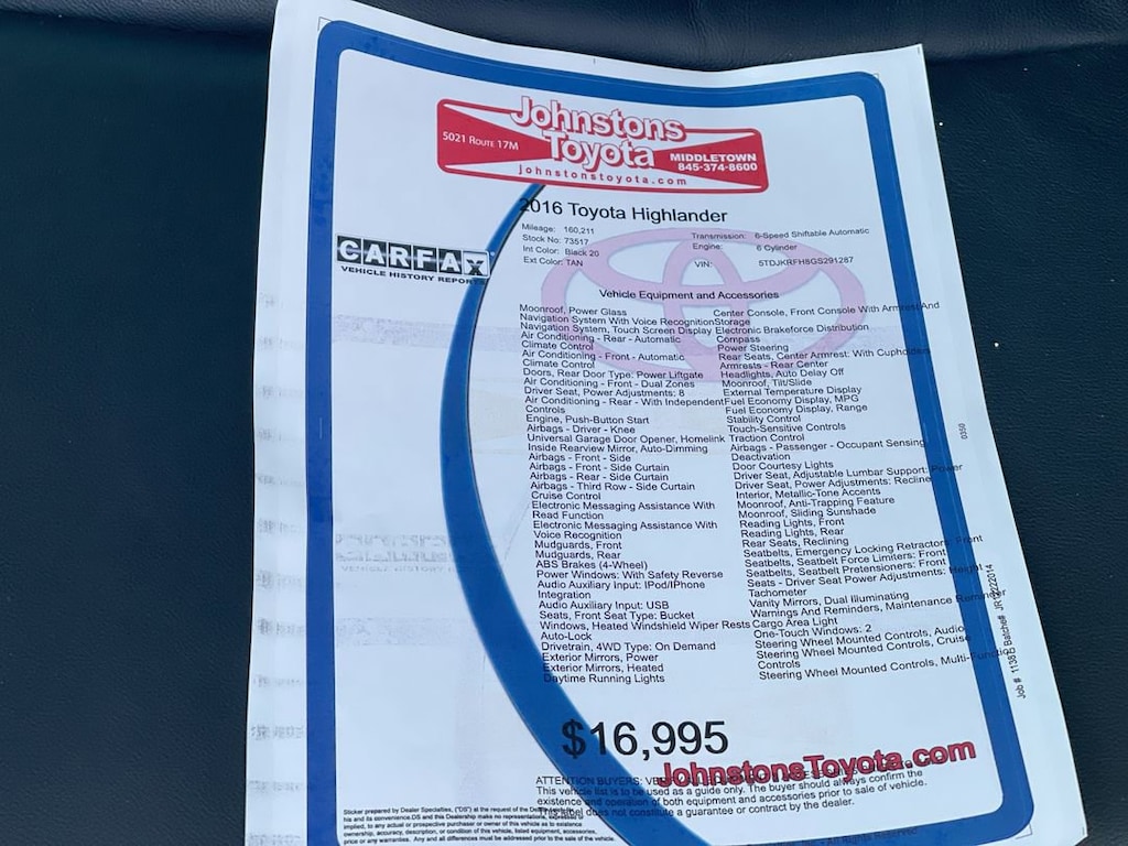 This vehicle is a 2016 Toyota Highlander XLE, an all-wheel drive SUV with a 3.5 liter 6 cylinder engine and sequential fuel injection. It has a tan exterior and black 20 interior, as well as a crash test rating of 5 out of 5 stars. With 160,211 miles driven, this motorcar offers hill start assist, on demand four wheel drive, navigation system with voice recognition, navigation with touch screen display, and leather third row seats. This car is sure to provide a reliable and comfortable ride for years to come. Johnstons Toyota is located in New Hampton, NY and proudly serves Warwick, Middletown, and Newburgh, New York. We are a premier Toyota Dealer in New York providing a full line of new and used cars , trucks, vans, and SUVs.