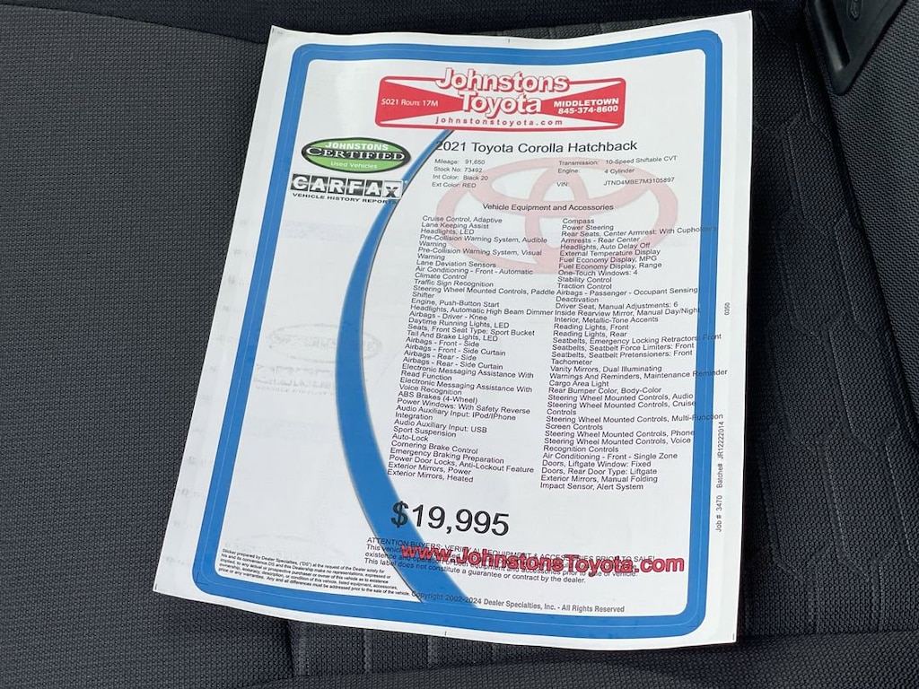 This 2021 Toyota Corolla Hatchback SE is a reliable and efficient vehicle. It has a 2.0 liter 4 cylinder engine with fuel injection, and Front Wheel Drive (FWD) capabilities. The exterior is a striking red, while the interior is a sleek black 20. With a crash test rating of 5 out of 5 stars, you can be sure that this car will keep you safe on the road. Additionally, it comes with hill start assist as an added feature for your convenience. With 91,650 miles already driven, this car is ready to take you on your next adventure! Johnstons Toyota is located in New Hampton, NY and proudly serves Warwick, Middletown, and Newburgh, New York. We are a premier Toyota Dealer in New York providing a full line of new and used cars , trucks, vans, and SUVs.