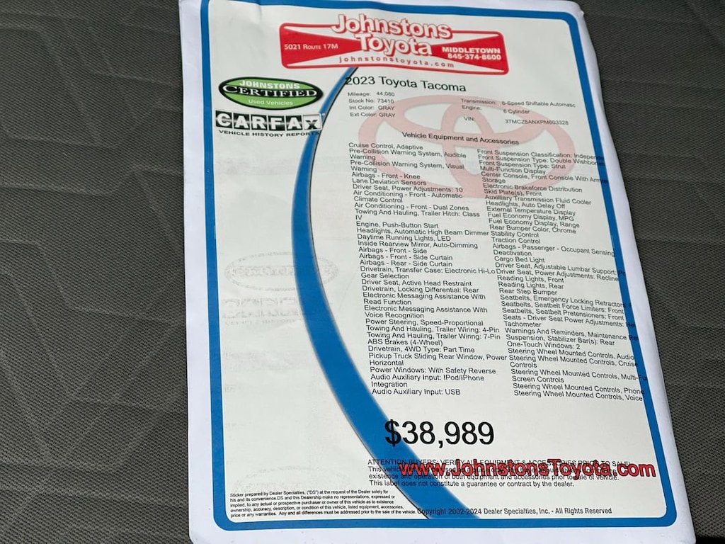 This vehicle is a 2023 Toyota Tacoma Double Cab 4x4 with a 3.5 liter 6 cylinder engine and fuel injection. It has driven 44,080 miles and features Hill Start Assist and Part Time Four Wheel Drive. The exterior of the car is gray while the interior is a light gray color. This car is sure to turn heads with its modern design and powerful performance. Johnstons Toyota is located in New Hampton, NY and proudly serves Warwick, Middletown, and Newburgh, New York. We are a premier Toyota Dealer in New York providing a full line of new and used cars , trucks, vans, and SUVs.