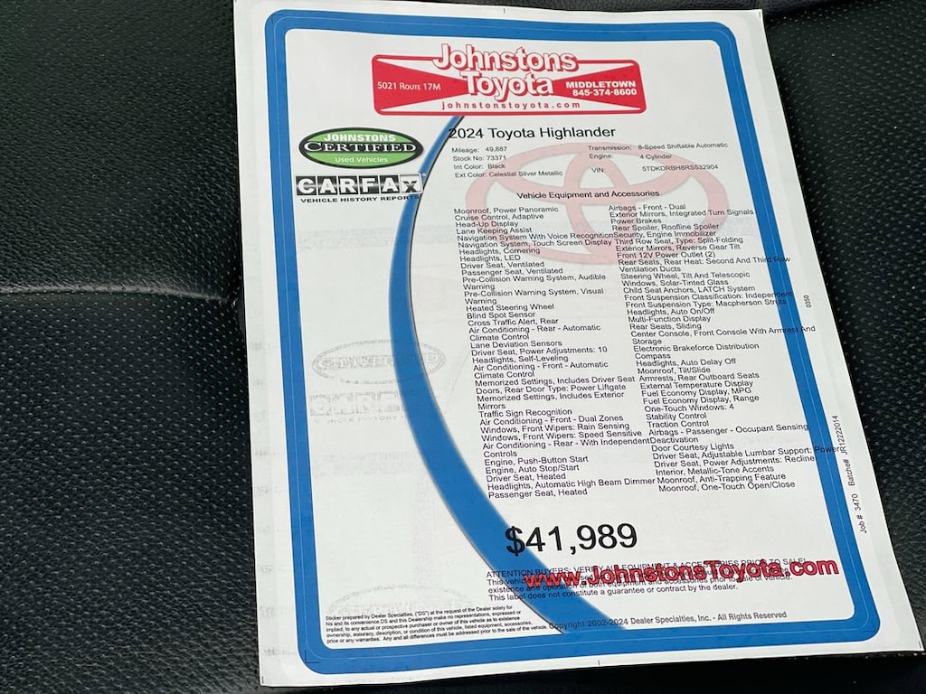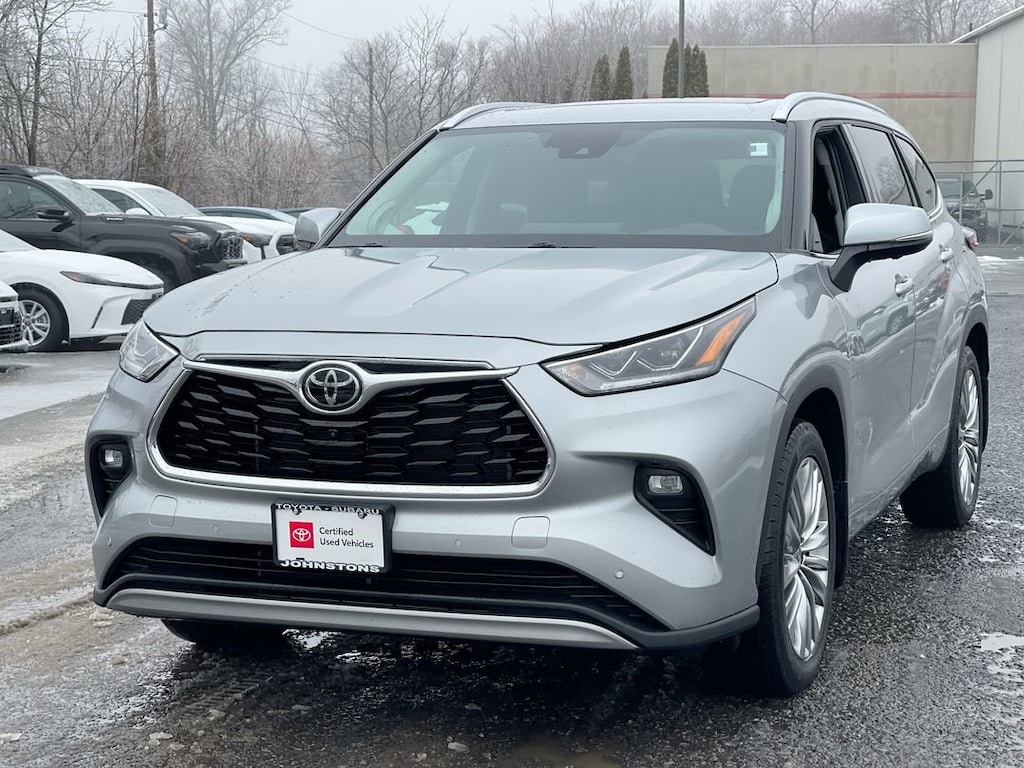This vehicle is a 2024 Toyota Highlander SUV All Wheel Drive with a 2.4 liter 4 cylinder engine and turbocharged power. It has a celestial silver metallic exterior and a black interior. It has a crash test rating of 5 out of 5 stars and features such as blind spot sensor, hill start assist, on demand four wheel drive, navigation system with voice recognition, leather third row seats, and much more. This car has driven 49,887 miles and is sure to be a reliable mode of transportation for years to come. Johnstons Toyota is located in New Hampton, NY and proudly serves Warwick, Middletown, and Newburgh, New York. We are a premier Toyota Dealer in New York providing a full line of new and used cars , trucks, vans, and SUVs.