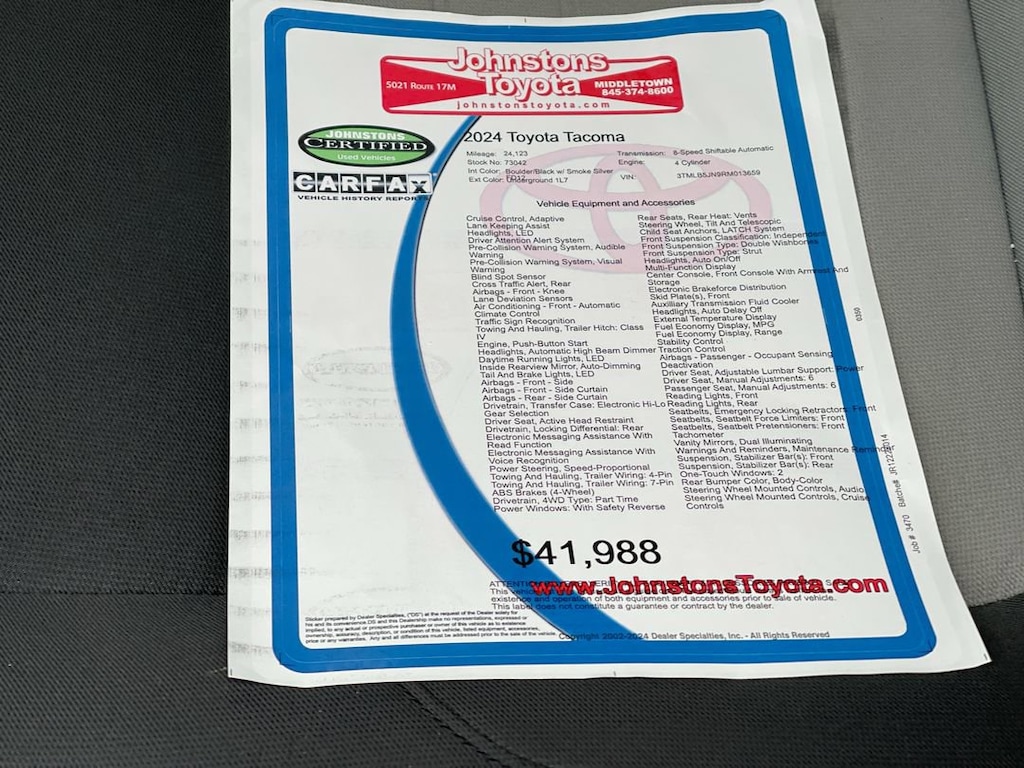 This vehicle is a 2024 Toyota Tacoma TRD Off-Road Double Cab 4x4, and it has driven 24,123 miles. It is powered by a 2.4 liter 4 cylinder engine with a turbocharger, and it has an underground 1L7 exterior. This automobile features blind spot sensor, hill start assist, and part time four wheel drive, as well as a boulder/black w/ smoke silver FD12 interior. This car is sure to turn heads with its sleek design and powerful performance. Johnstons Toyota is located in New Hampton, NY and proudly serves Warwick, Middletown, and Newburgh, New York. We are a premier Toyota Dealer in New York providing a full line of new and used cars , trucks, vans, and SUVs.