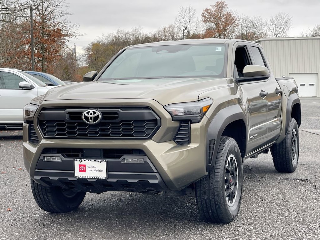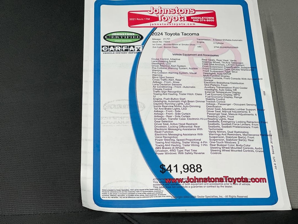 This vehicle is a 2024 Toyota Tacoma TRD Off-Road Double Cab 4x4, with a 2.4 liter 4 cylinder engine, and turbocharged power. It has driven 21,701 miles and features blind spot sensor, hill start assist, and part time four wheel drive. The exterior of this car is made of bronze oxide 6x1 and the interior is accented with a boulder/black w/ smoke silver FD12 color scheme. This car is sure to turn heads on the road with its powerful yet efficient 4x4 capabilities and modern features. Johnstons Toyota is located in New Hampton, NY and proudly serves Warwick, Middletown, and Newburgh, New York. We are a premier Toyota Dealer in New York providing a full line of new and used cars , trucks, vans, and SUVs.