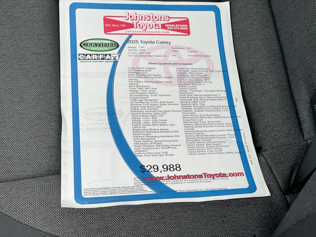 This vehicle is a 2025 Toyota Camry LE, a low mileage motorcar with 7,430 miles. It is equipped with a FWD 2.5 liter 4 cylinder engine and a midnight black metallic exterior. It has a black fa20 interior and a crash test rating of 5 out of 5 stars. Vehicle features include blind spot sensor and hill start assist, making it an ideal choice for drivers looking for added safety and convenience. This car is sure to turn heads on the road with its sleek design and modern features. Johnstons Toyota is located in New Hampton, NY and proudly serves Warwick, Middletown, and Newburgh, New York. We are a premier Toyota Dealer in New York providing a full line of new and used cars , trucks, vans, and SUVs.