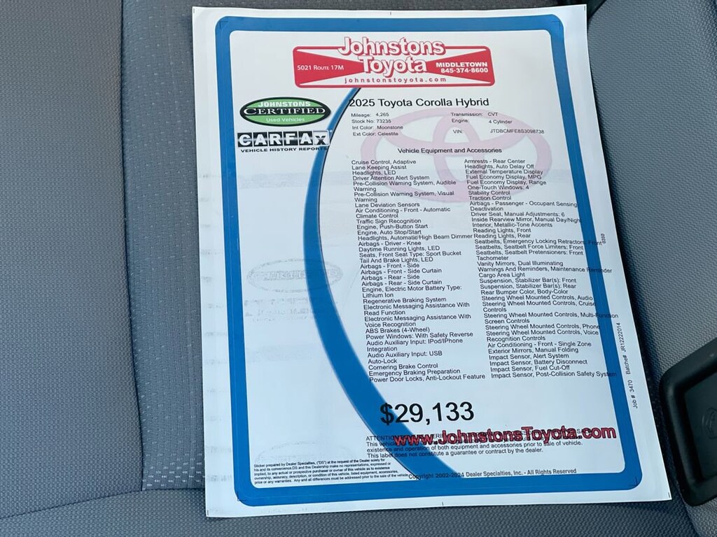 This vehicle is a 2025 Toyota Corolla Hybrid SE, made with low mileage and a 1.8 liter 4 cylinder engine, sequential port fuel injection, and FWD. It has a crash test rating of 5 out of 5 stars and a celestite 1k3 exterior. The interior of this car is moonstone fc23, and it has a crash test rating of 5 out of 5 stars as well. This car has many features that make it safe and reliable, such as hill start assist and a moonstone fc23 interior. This car is the perfect choice for anyone looking for a reliable and safe ride in the future. Johnstons Toyota is located in New Hampton, NY and proudly serves Warwick, Middletown, and Newburgh, New York. We are a premier Toyota Dealer in New York providing a full line of new and used cars , trucks, vans, and SUVs.
