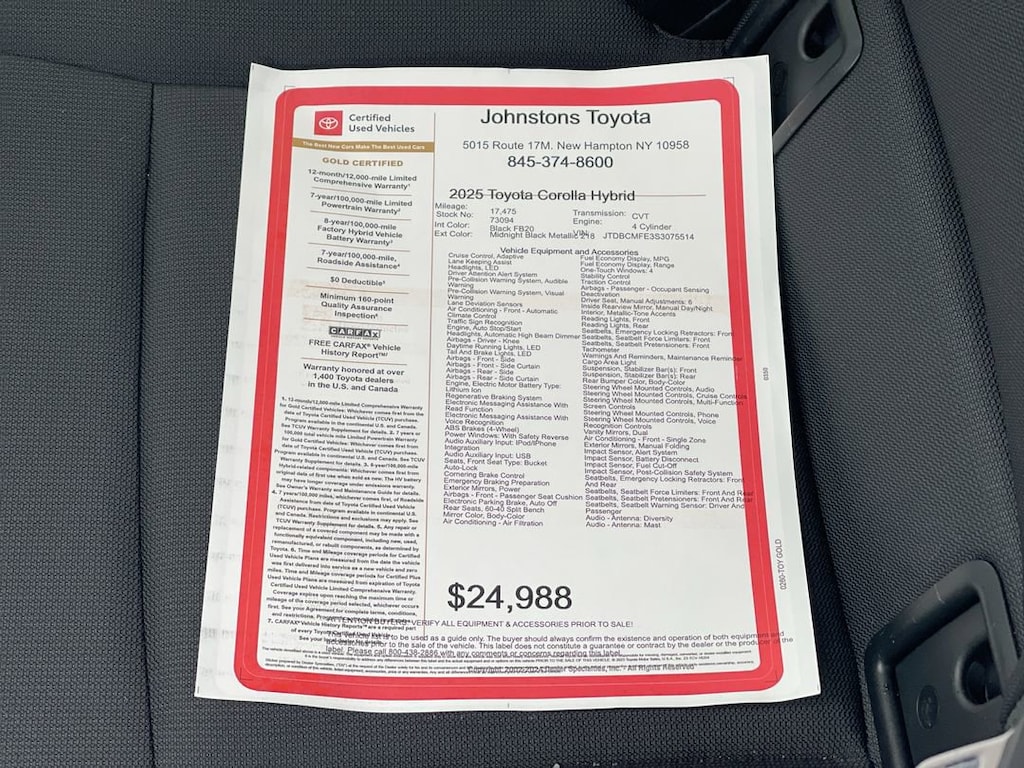 This vehicle is a 2025 Toyota Corolla Hybrid LE, certified pre-owned and with 17,475 miles. It has a 1.8 liter 4 cylinder engine with sequential port fuel injection and FWD capabilities. The exterior of the car is midnight black metallic and the interior is black with a fb20 finish. It has a crash test rating of 5 out of 5 stars and features such as hill start assist. This car is truly one of a kind and will surely turn heads wherever it goes. Johnstons Toyota is located in New Hampton, NY and proudly serves Warwick, Middletown, and Newburgh, New York. We are a premier Toyota Dealer in New York providing a full line of new and used cars , trucks, vans, and SUVs.