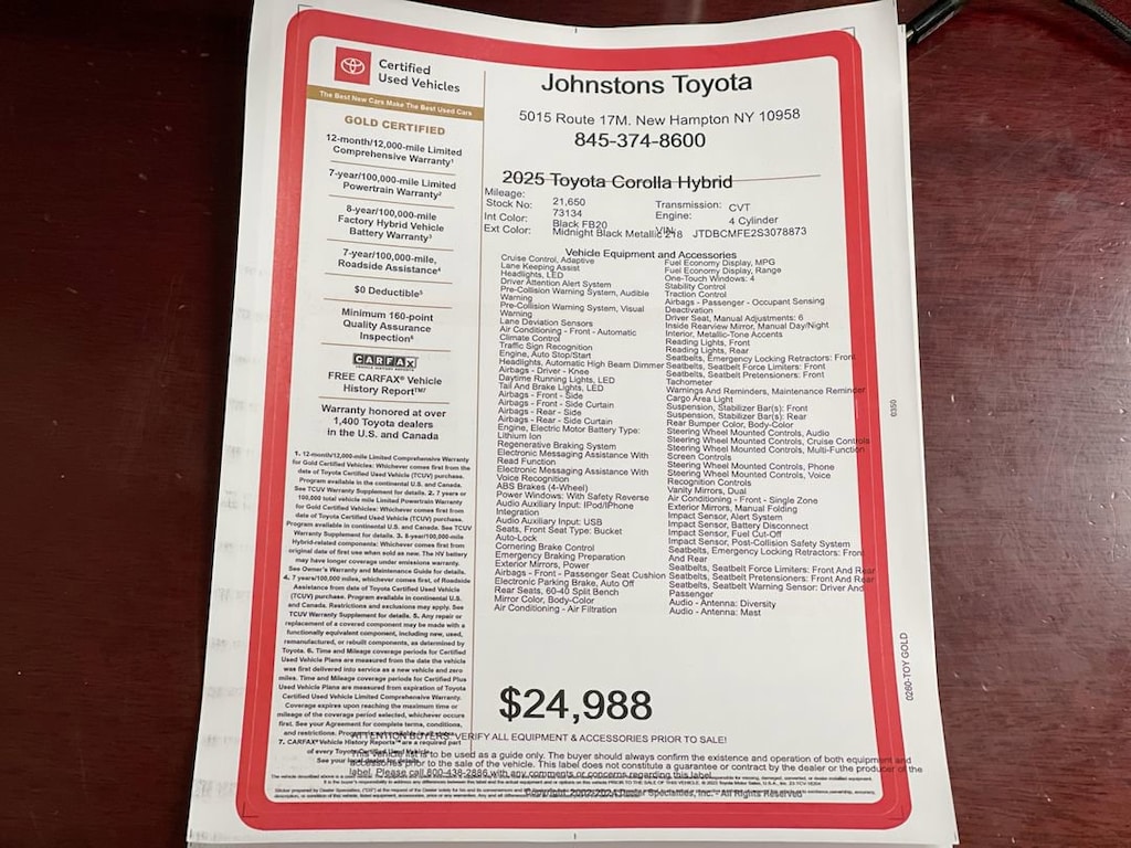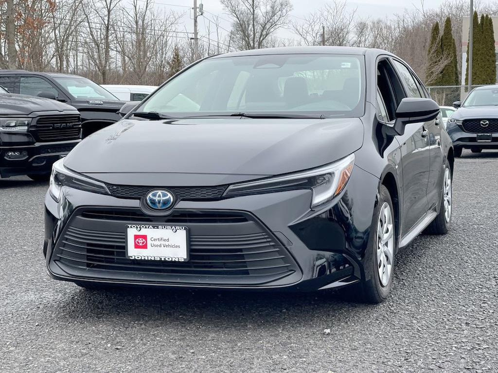 This vehicle is a 2025 Toyota Corolla Hybrid LE, with a certified pre-owned status and 21,650 miles driven. It features a 1.8 liter 4 cylinder engine with sequential port fuel injection, and FWD capabilities. The exterior of the vehicle is midnight black metallic 218, while the interior is black fb20. This vehicle has been given a crash test rating of 5 out of 5 stars, and also includes hill start assist as one of its features. With its combination of power, safety, and style, this Vehicle is sure to make an impression wherever it goes. Johnstons Toyota is located in New Hampton, NY and proudly serves Warwick, Middletown, and Newburgh, New York. We are a premier Toyota Dealer in New York providing a full line of new and used cars , trucks, vans, and SUVs.