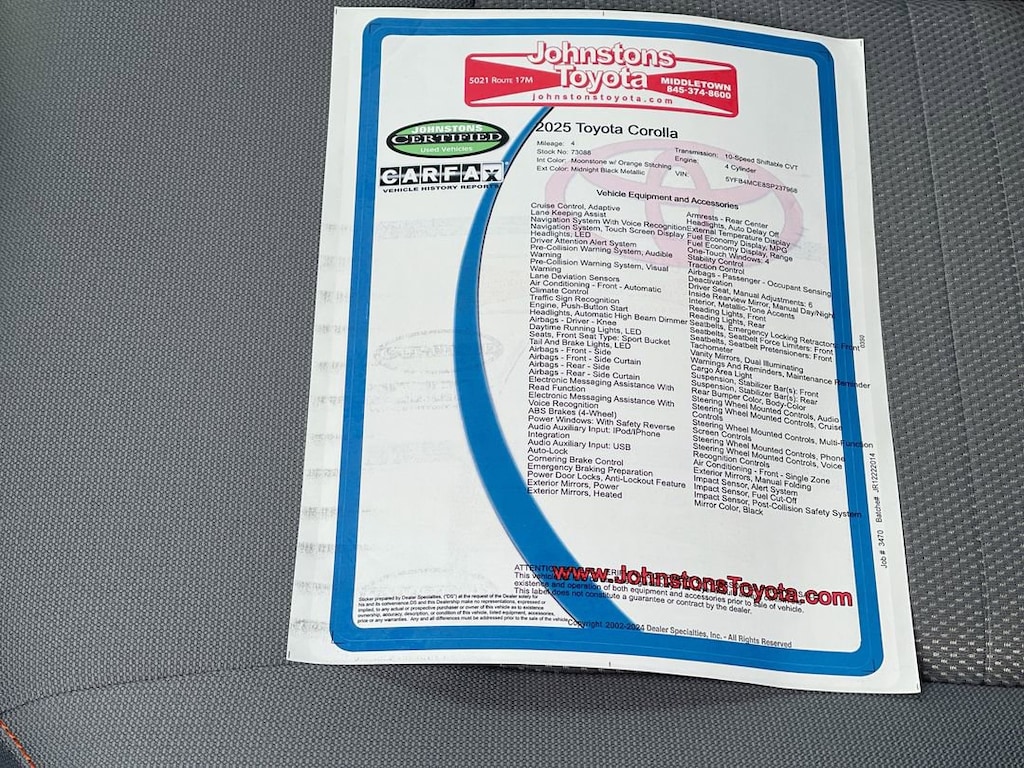 This vehicle is a 2025 Toyota Corolla FX Sedan, with low mileage of 4 miles. It is equipped with a 2.0 liter 4 cylinder engine and fuel injection, and has a midnight black metallic exterior with an orange stitching interior. It has a 5 out of 5 star crash test rating and features such as hill start assist, and navigation with voice recognition and touch screen display. This automobile is sure to turn heads on the road with its sleek design and modern technology. Johnstons Toyota is located in New Hampton, NY and proudly serves Warwick, Middletown, and Newburgh, New York. We are a premier Toyota Dealer in New York providing a full line of new and used cars , trucks, vans, and SUVs.