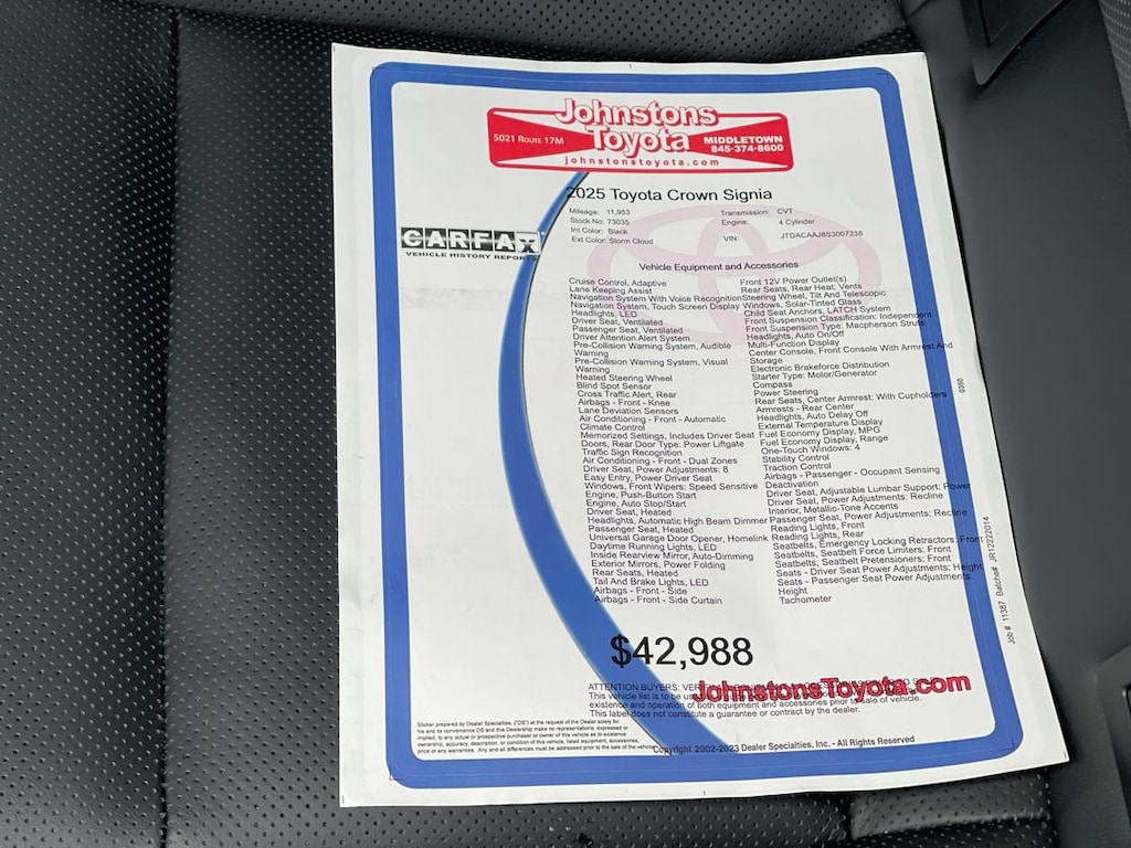 This vehicle is a 2025 Toyota Crown Signia XLE, an all-wheel drive with a 2.5 liter 4 cylinder engine and a storm cloud exterior. It has driven 11,953 miles and features blind spot sensor, hill start assist, on demand four wheel drive, navigation system with voice recognition, and navigation with touch screen display. This car is sure to turn heads with its sleek black exterior and luxurious black interior. With its advanced features and reliable performance, this car is sure to be a reliable companion for years to come. Johnstons Toyota is located in New Hampton, NY and proudly serves Warwick, Middletown, and Newburgh, New York. We are a premier Toyota Dealer in New York providing a full line of new and used cars , trucks, vans, and SUVs.