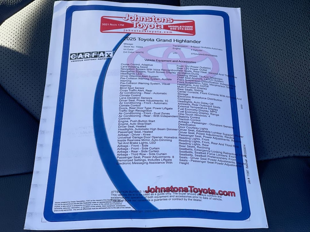 This vehicle is a 2025 Toyota Grand Highlander, a low mileage vehicle with 5,134 miles. It is equipped with a 2.4 liter 4 cylinder engine, turbocharged, and FWD, making it an ideal choice for any driver. The vehicle's exterior is a sleek, wind chill pearl color, while the interior is finished in a luxurious black. Vehicle features include blind spot sensor, hill start assist, navigation system with voice recognition, and navigation with touch screen display. This car is sure to make any journey more enjoyable and safe. Johnstons Toyota is located in New Hampton, NY and proudly serves Warwick, Middletown, and Newburgh, New York. We are a premier Toyota Dealer in New York providing a full line of new and used cars , trucks, vans, and SUVs.