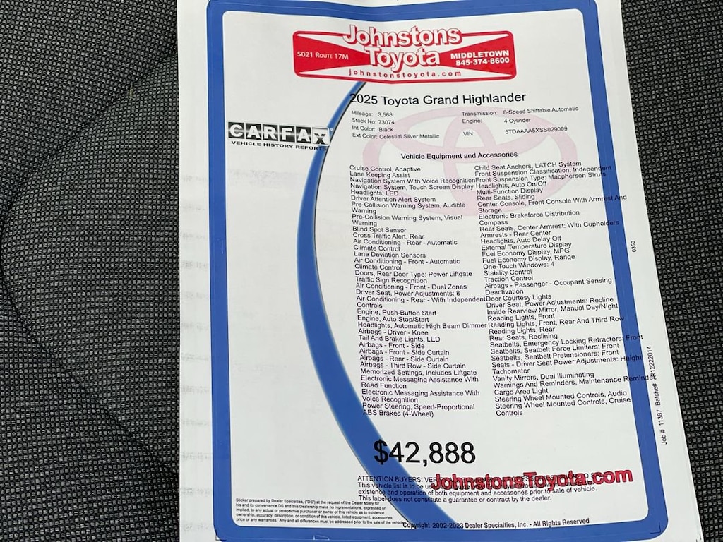 This vehicle is a 2025 Toyota Grand Highlander LE, with low mileage of 3,568 miles. It is a FWD, 2.4 liter 4 cylinder engine with turbocharged power, and an celestial silver metallic exterior. It has a black interior and features such as blind spot sensor, hill start assist, navigation system with voice recognition, and navigation with touch screen display. This car is sure to turn heads with its sleek design and impressive performance. Johnstons Toyota is located in New Hampton, NY and proudly serves Warwick, Middletown, and Newburgh, New York. We are a premier Toyota Dealer in New York providing a full line of new and used cars , trucks, vans, and SUVs.