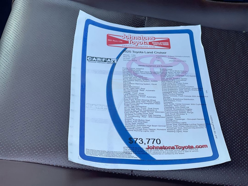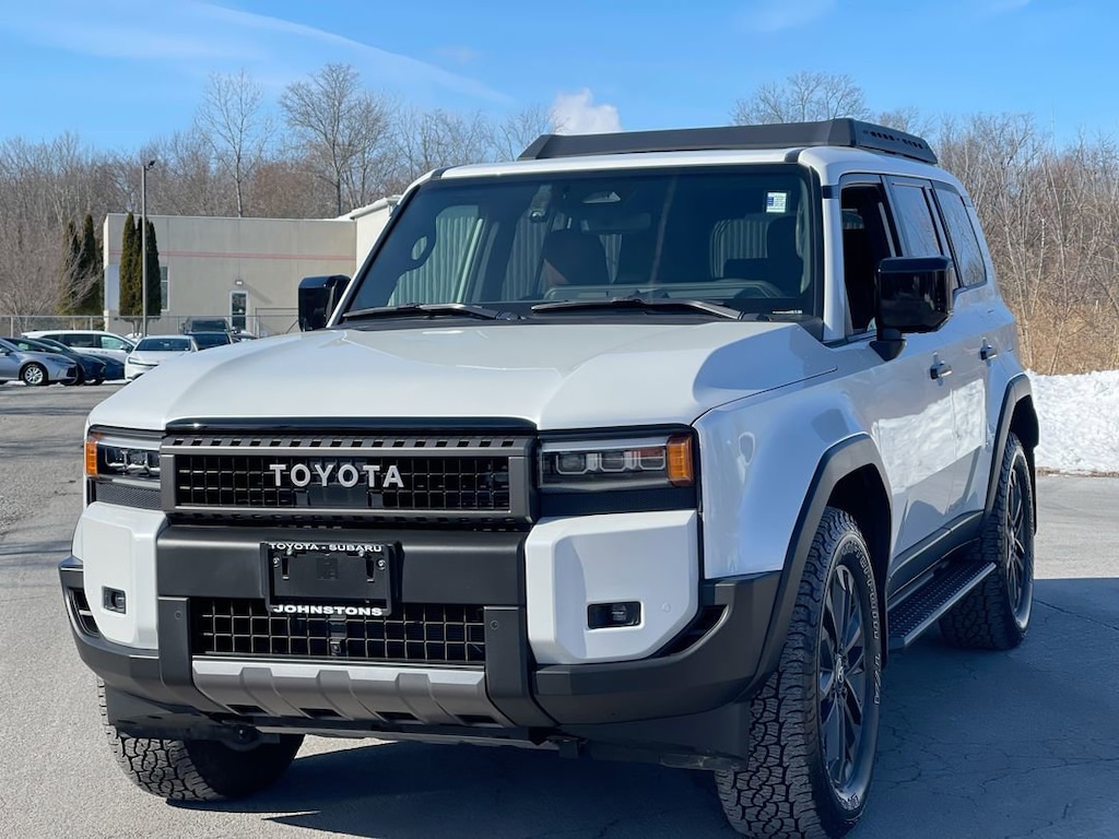 This vehicle is a 2025 Toyota Land Cruiser SUV 4x4, with low mileage of 7,334 miles. It is a 2.4 liter 4 cylinder engine with a white exterior and a java interior. It has a crash test rating of 4 out of 5 stars and features such as blind spot sensor, hill start assist, full time four wheel drive, navigation system with voice recognition, and navigation with touch screen display. This car is truly a marvel of modern engineering and design. Johnstons Toyota is located in New Hampton, NY and proudly serves Warwick, Middletown, and Newburgh, New York. We are a premier Toyota Dealer in New York providing a full line of new and used cars , trucks, vans, and SUVs.
